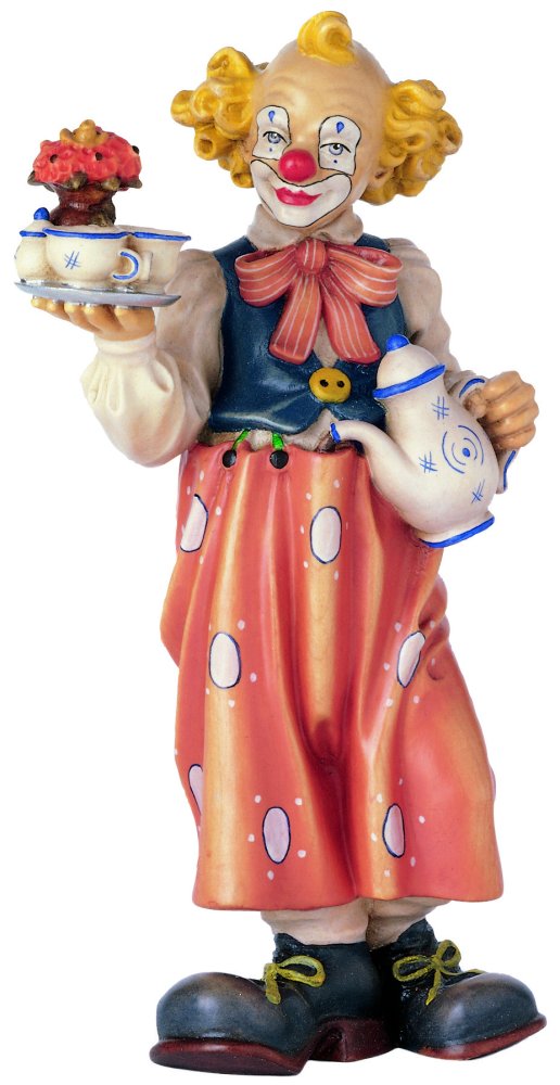 Clown mit Kaffeeservice - aus Ahornholz geschnitzte Figur, 14cm hoch Schnitzfiguren aus Südtirol - das Schmuckstück Ihrer Wohnung. Neben den vielen Holzspielwaren vom Holzlädle, finden Sie bei uns, auch das besondere Geschenk. Der aus Ahornholz geschnitzte Clown mit Kaffeeservice ist 14cm groß. Die sehr schön gearbeitete Figur: Clown mit Kaffeeservice ist farbig bemalt und ein Geschenk der Extraklasse. Durch die Struktur und Farbe des Holzes und durch die individuelle Bemalung von Hand, unterscheiden sich alle Schnitzfiguren voneinander, somit ist jede einzelne Schnitzfigur als Einzelstück an zu sehen. Ihre persönliche Schnitzerei, gibt es deshalb auch kein zweites Mal in genau der gleichen Ausführung. Holz reagiert auf Temperaturen und Feuchtigkeit, deshalb sollte ein gleichmäßiges Raumklima bewahrt werden. Durch natürliche Lichteinwirkungen kann das Holz im Laufe der Zeit seine Farbe verändern. Wenn Sie andere Figuren oder Reliefs suchen, fragen Sie einfach bei uns an, wir können vieles für Sie besorgen. Der Clown mit Kaffeeservice ist in den Ausführungen: naturbelassen und farbig bemalt, sowie in den Größen: 14cm + 18cm erhältlich. Alle Modelle sind urheberrechtlich geschützt. |