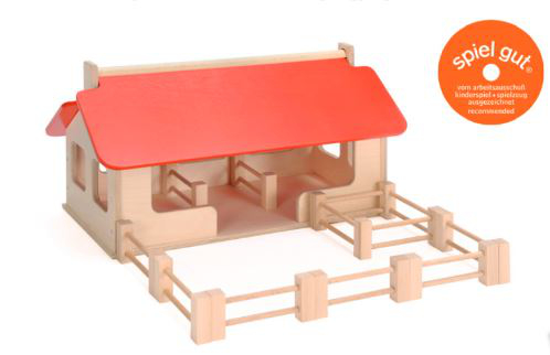 Bauernhof, LxBxH 55x32x28 Spielräume für Kinderträume mit den Gebäuden vom Bauernhof. Spielend, das Leben auf dem Bauernhof erleben - mit diesen massiven Holzställen. Handgestaltetes Holzspielzeug, weckt und fördert die Kreativkräfte im Kind und regt zum phantasievollen Spielen an. Kinder tauchen mit diesem pädagogisch wertvollen Spielzeug, eines der vielen Holzspielwaren aus dem Holzlädle, in ihre Welten ein und spielen das Leben auf dem Bauernhof nach. Inhalt: 1 Stallgebäude, 8 Zaunelemente, 1 Gatter 4-seitig, Die Zaunelemente können variabel aufgestellt werden. Das rote Dach ist aufklappbar für bequemes Bespielen. Nach dem Spielen wird alles im Haus verstaut und an der Firststange weggetragen. Mit dem Spiel-gut-Zeichen ausgezeichnet. Material: Birke Multiplex, Buche massiv Bauernhof, LxBxH 55x32x28 |