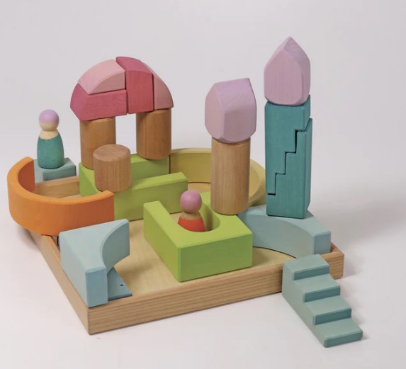 Bauwelt Wolkenspiel Die pastellig luftigen Töne der Bauwelt Wolkenspiel verleihen dem massiven Holz eine zarte Leichtigkeit. Die Baumaterialien in verschiedensten Formen ermöglichen fantasievolles freies Bauen und ergänzen das GRIMM’S Sortiment mit ihren liebevollen Details, wie blütenartigen Abrundungen, asymmetrischen Brüchen und einer montierbaren, beweglichen Türe. Unsere Bauwelten kommen in einem handlichen Rahmen und warten nur darauf, ihn zusammen mit der Fantasie eines Kindes zu sprengen. Sie sind praktisch kleine Baukästen, die eine ganz besondere Spielwelt mitbringen. Perfekt unvollständig laden sie dazu ein, die eigene Fantasie hinzuzufügen und immer neue Welten zu erschaffen. Holz: Linde farblich lasiert, Erle geölt |