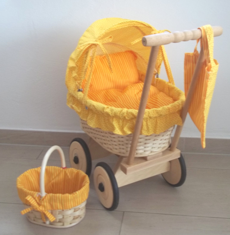 Korb-Puppenwagen gelb, gummibereift, mit Bettgarnitur, LxBxH ca. 55x32x58cm Der Puppenwagen ist auch ein Klassiker unter den Holzspielwaren. Unser Korbpuppenwagen, gehört deshalb ebenso, wie alle anderen Holzspielwaren, zum Sortiment vom Holzlädle. Auch beim Spielen mit dem Puppenwagen, können die kleinen Puppenmuttis Ihre ganze Fantasie ausleben. Der Korpus des Puppenwagens ist aus Kobgeflecht gefertigt und naturbelassen, mit Faltdach,die Räder sind gummibereift,die Bettgarnitur ist im gelben Dekor, er wird in der Werkstatt für Behinderte Menschen in Sennfeld hergestellt. Der Puppenwagen ist ein wichtiges Spielzeug für die Entwicklung Ihrer Kinder, allerdings ist der Puppenwagen kein Kinderwagen. Leichte Farbunterschiede sind nicht als Fehler anzusehen, sondern sind ein Merkmal des lebendigen Werkstoffes Holz. LxBxH ca. 55x30x58cm |