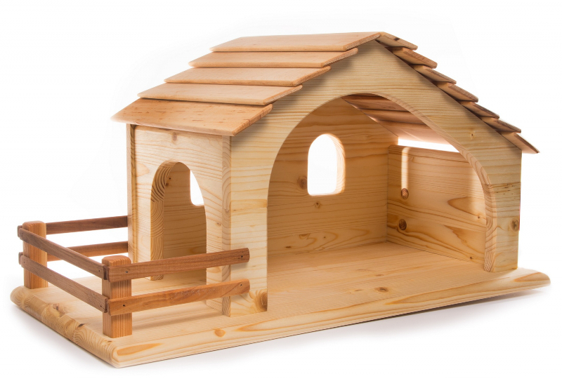 Pferdestall mit Koppel, LxBxH 58x28x29 Spielräume für Kinderträume mit den Gebäuden vom Bauernhof. Spielend, das Leben auf dem Bauernhof erleben - mit diesen massiven Holzställen. Handgestaltetes Holzspielzeug, weckt und fördert die Kreativkräfte im Kind und regt zum phantasievollen Spielen an. Kinder tauchen mit diesem pädagogisch wertvollen Spielzeug, eines der vielen Holzspielwaren aus dem Holzlädle, in ihre Welten ein und spielen das Leben auf dem Bauernhof nach. Schöner Tierstall aus wunderschönem hellen, geölten Fichtenholz Drei Blätter Naturspielwaren hat diesen Stall, der auch wunderbar zu Weihnachten als Krippe dienen kann, kindgerecht mit offenen Fenstern gestaltet, so dass das Holzhaus von verschiedenen Seiten bespielt werden kann. Durch die glatt geschliffenen Oberflächen fühlt sich das Holz sehr angenehm weich an. Drei Blätter Naturspielwaren hat richtige Dachschindeln aus Erle verbaut, die den Stall besonders authentisch und gemütlich aussehen lassen! Der Drei Blätter Krippenstall verfügt über eine schöne Koppel, die den Stall vielfach nutzbar macht. Das ganze Jahr über spielen die Kinder mit dem Holzhaus Puppenhaus oder Pferdestall. Weihnachten wird dann der Drei Blätter Pferdestall zur großen Krippe. Pferdestall mit Koppel, LxBxH 58x28x29 |