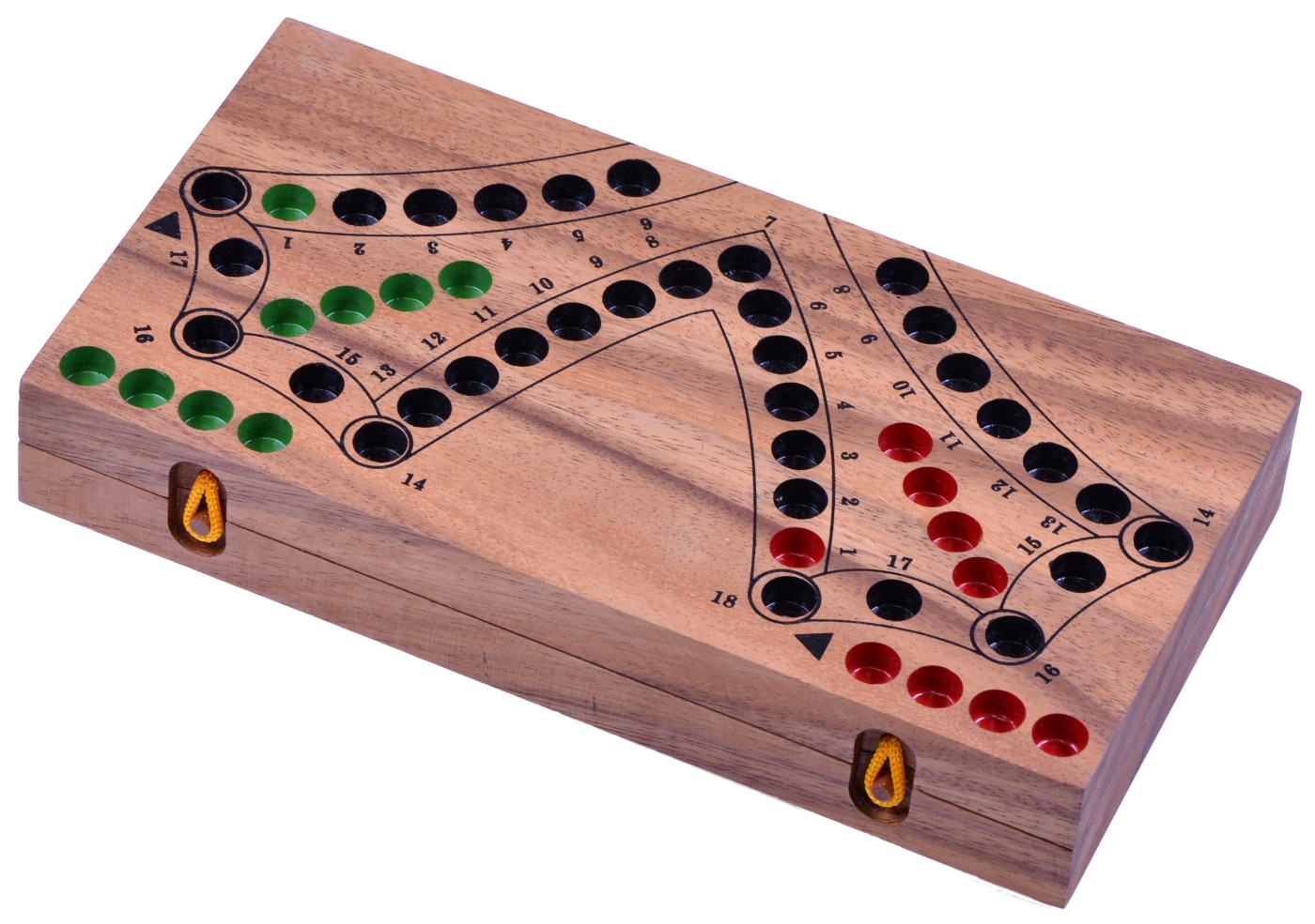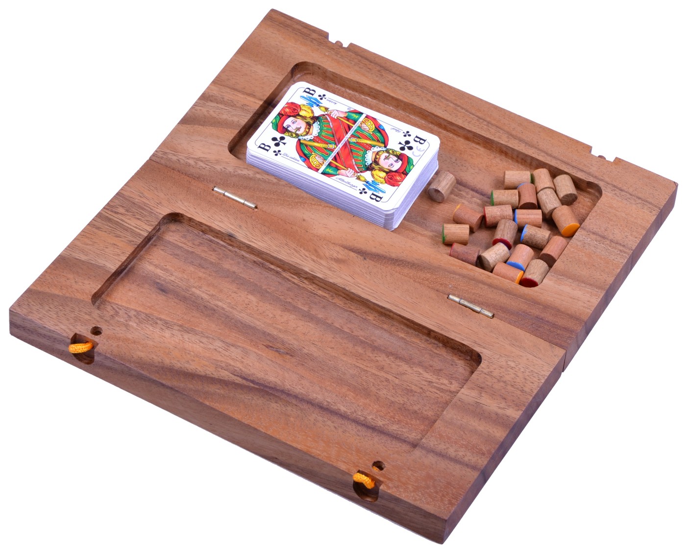 Tock für 4 Spieler - Spielfeld 27 x 26 cm - Gesellschaftsspiel mit Spielkarten Tock - die einzigartige Kombination aus Brett- und Kartenspiel - kann ohne Übertreibung als kleine Revolution auf dem Feld der Taktik-Spiele bezeichnet werden. Trotz einfacher Regeln entwickelt sich jedes Spiel schnell zu einer spannenden Herausforderung, Das Ziel jedes der beiden Zweier-Teams ist es, als erstes die eigenen Kugeln ins "Haus" zu bringen. Doch das ist einfacher gesagt als getan... Denn nur starkes Teamplay und vorausschauende, flexible Taktik ebnen den Weg zum Erfolg! Je zwei Spieler, die sich diagonal gegenüber sitzen, bilden ein Paar. Die Paare spielen im gesamten Spielverlauf zusammen und gewinnen oder verlieren auch gemeinsam. Gewonnen hat das Paar, das nach Umrunden des Spielfeldes als Erstes alle Spielsteine in seine Zielfelder gebracht hat. Statt eines Würfels wird ein Kartenspiel mit 52 Karten verwendet. Die komplexen Spielregeln und die liebevolle Gestaltung des Spielfeldes machen dieses Gesellschaftsspiel zu einem ganz besonderen Spielvergnügen. • Spiel Das Spiel besteht aus einem nummerierten Spielbrett, je 4 Spielsteinen in den Farben rot, gelb, grün und blau sowie einem Kartenspiel mit 52 Karten. Wir liefern das Spiel mit einem dekorativen und strapazierfähigen Stoffbeutel, in dem das Spiel und die Spielkarten zusammen aufbewahrt werden können. Der Beutel wurde aus 100% Baumwolle gefertigt. • Verwendetes Holz Dieses Spiel wurde aus umweltfreundlichem Plantagenholz vom Samena-Baum (lat. Pithecellobium Saman) in aufwändiger Handarbeit und mit einfachen Maschinen in Südostasien gefertigt. Familienspiele,Gesellschaftsspiele,Lernspiele - spielen in geselliger Runde. Spielen mit Freunden - fördert soziales Verhalten - macht riesigen Spaß - spielerisch logisches und taktisches Denken erlernen - erzeugt viele schöne und glückliche Momente Im holzlaedle.com finden Sie auch tolle Spiele für Jung und Alt - hergestellt aus Holz - schauen Sie einfach mal rein. Starke Spiele für Groß und Klein • Maße Spielfeld offen: 27 x 26 x 2 cm Spielfeld geschlossen: 13,5 x 26 x 4 cm Gewicht: ca. 685 Gramm Alter: Ab 6 Jahre ACHTUNG: Wegen verschluckbarer Kleinteile NICHT für Kinder unter 3 Jahren geeignet!