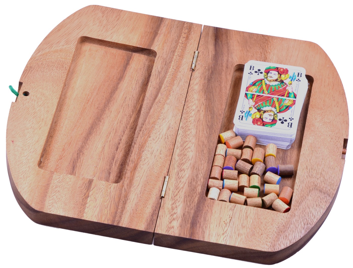 Tock für 6 Spieler - Spielfeld 33 x 28 cm - Gesellschaftsspiel mit Spielkarten Tock - die einzigartige Kombination aus Brett- und Kartenspiel - kann ohne Übertreibung als kleine Revolution auf dem Feld der Taktik-Spiele bezeichnet werden. Trotz einfacher Regeln entwickelt sich jedes Spiel schnell zu einer spannenden Herausforderung, Das Ziel jedes der beiden Zweier-Teams ist es, als erstes die eigenen Kugeln ins "Haus" zu bringen. Doch das ist einfacher gesagt als getan... Denn nur starkes Teamplay und vorausschauende, flexible Taktik ebnen den Weg zum Erfolg! Je zwei Spieler, die sich diagonal gegenüber sitzen, bilden ein Paar. Die Paare spielen im gesamten Spielverlauf zusammen und gewinnen oder verlieren auch gemeinsam. Gewonnen hat das Paar, das nach Umrunden des Spielfeldes als Erstes alle Spielsteine in seine Zielfelder gebracht hat. Statt eines Würfels wird ein Kartenspiel mit 52 Karten verwendet. Die komplexen Spielregeln und die liebevolle Gestaltung des Spielfeldes machen dieses Gesellschaftsspiel zu einem ganz besonderen Spielvergnügen. • Spiel Das Spiel besteht aus einem nummerierten Spielbrett, je 4 Spielsteinen in den Farben rot, gelb, grün, lila, orange und blau sowie einem Kartenspiel mit 52 Karten. Wir liefern das Spiel mit einem dekorativen und strapazierfähigen Stoffbeutel, in dem das Spiel und die Spielkarten zusammen aufbewahrt werden können. Der Beutel wurde aus 100% Baumwolle gefertigt. • Verwendetes Holz Dieses Spiel wurde aus umweltfreundlichem Plantagenholz vom Samena-Baum (lat. Pithecellobium Saman) in aufwändiger Handarbeit und mit einfachen Maschinen gefertigt. Familienspiele,Gesellschaftsspiele,Lernspiele - spielen in geselliger Runde. Spielen mit Freunden - fördert soziales Verhalten - macht riesigen Spaß - spielerisch logisches und taktisches Denken erlernen - erzeugt viele schöne und glückliche Momente Im holzlaedle.com finden Sie auch tolle Spiele für Jung und Alt - hergestellt aus Holz - schauen Sie einfach mal rein. Starke Spiele für Groß und Klein • Maße Spielfeld offen: 33 x 28 x 2 cm Spielfeld geschlossen: 16,5 x 28 x 4 cm Gewicht: ca. 860 Gramm Alter: Ab 6 Jahre ACHTUNG: Wegen verschluckbarer Kleinteile NICHT für Kinder unter 3 Jahren geeignet! ![]()