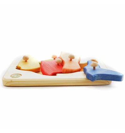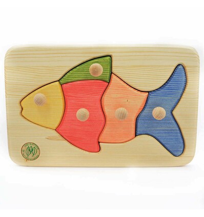 Massivholzpuzzle Fisch, Größe: 30 x 20 x 4 cm Spielen macht Riesenspass - ob Bilderwürfel, Puzzle, Legespiele, Memospiele, Lernspiele, Motorikspiele, Mitbringspiele oder Familienspiele, im Holzlädle, finden das richtige Spiel. Wir führen Spiele von Selecta, Haba, Erzi und anderen Herstellern, dies sind starke Spiele für Groß und Klein. In Handarbeit gefertigtes Massivholzpuzzle - Fisch - aus Fichtenholz, mit naturbelassenem Holzboden und farbigen Puzzleteilen. Jedes Puzzleteil hat seine eigene Form und Farbe. Die Knöpfe erlauben es dem Kind die Puzzleteile schon früh zu ordnen. So wird spielerrisch die Greiffähigkeit und Motorik gefördert. Dreiblätter Naturspielzeug legt großen Wert auf eine sorgfältige Bearbeitung und eine schadstofffreie Verarbeitung mit biologischen Ölen und farblichen Lasuren. Größe: 30 x 20 cm Altersempfehlung: ab 36 Monaten Hergestellt in Handarbeit in Deutschland. Drei Blätter Naturspielwaren ist ein traditioneller Holzspielzeughersteller mit langjähriger Erfahrung. Drei Blätter Holzspielzeuge sind stehen für kindgerechte Verarbeitung, hohen pädagogischen Anspruch, sozial-gerechte Herstellung und Produkte aus nachwachsenden Rohstoffen. Herausnehmen, anfassen, anschauen, erkennen, probieren, einfügen - Puzzle sind ein Riesenspielspass für Kinder, um Formen, Größen, Konturen und Proportionen spielerisch zu begreifen. ![]()