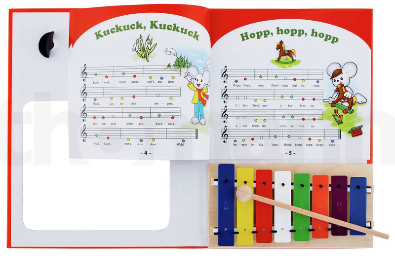 Metallophonbuch - Musizieren nach bunten Noten, ab 3 Jahren Mit diesem farbig illustrierten Liederbuch soll der kleine Musikant ab 3 Jahre die Möglichkeit erhalten, spielend leicht das Notensystem zu erlernen. Sobald das Kind gelernt hat, Farben zu unterscheiden, kann es mit Hilfe des 8-tönigen Metallophones zunächst nach bunten Ringen, dann nach bunten Noten und schließlich nach gesetzten Noten Lieder spielen lernen. - Klangrein gestimmt