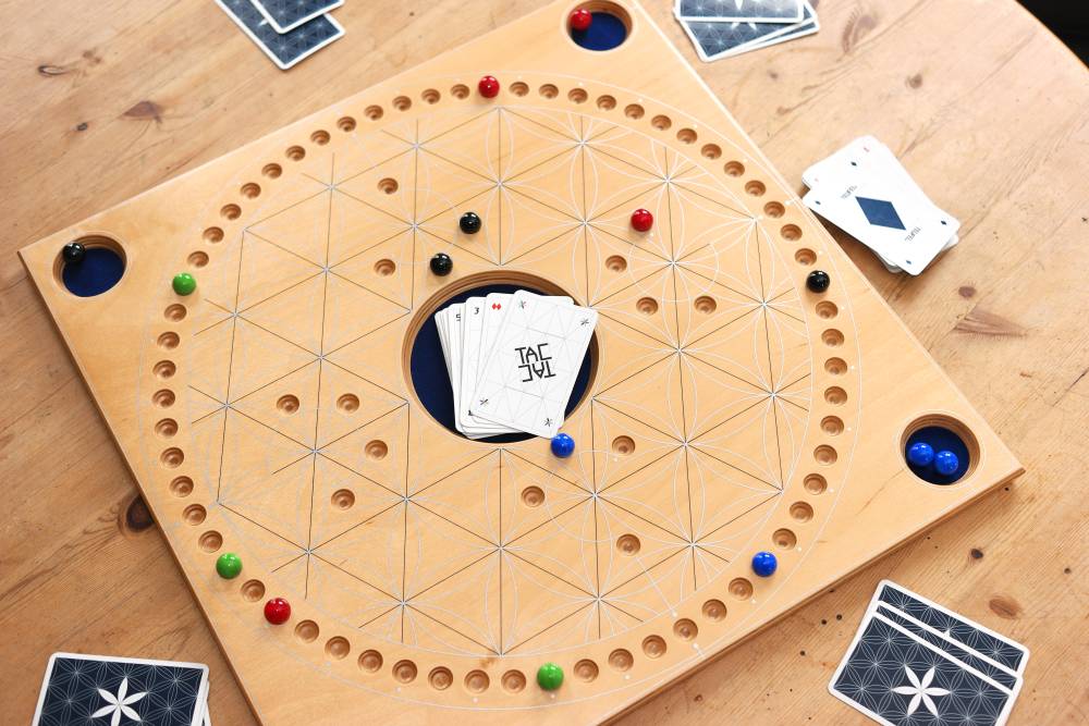 TAC - das spannende TACtik-Teamspiel - das kleine TAC für 4 Spieler TAC - der neue Klassiker TAC - die einzigartige Kombination aus Brett- und Kartenspiel - kann ohne Übertreibung als kleine Revolution auf dem Feld der Tactik-Spiele bezeichnet werden. Trotz einfacher Regeln entwickelt sich jedes Spiel schnell zu einer spannenden Herausforderung, Das Ziel jedes der beiden Zweier-Teams ist es, als erstes die eigenen Kugeln ins "Haus" zu bringen. Doch das ist einfacher gesagt als getan... Denn nur starkes Teamplay und vorausschauende, flexible Tactik ebnen den Weg zum Erfolg! TAC - das spannende TACtik-Teamspiel Je zwei Spieler, die sich diagonal gegenüber sitzen, bilden ein Paar. Die Paare spielen im gesamten Spielverlauf zusammen und gewinnen oder verlieren auch gemeinsam. Gewonnen hat das Paar, das nach Umrunden des Spielfeldes als Erstes alle Spielsteine in seine Zielfelder gebracht hat. Statt eines Würfels wird ein Kartenspiel mit 104 Karten verwendet. Ein paar Funktionen der Sonderkarten erklärt: Karte 1+13: Eine Kugel aufs Startfeld legen oder ein Feld ( Karte 1) oder bei Karte 13 dreizehn Felder ziehen. Karte 4: Eine beliebig eigene Kugel vier Feld rückwärts ziehen. Karte 7: Die 7 kann in beliebig viele Einzelschritte zerlegt werden. Mit Ihr können eine oder mehrere eigene Kugeln auf dem Spielkreis vorwärts gezogen werden. Karte 8: Eine beliebig eigene Kugel acht Felder vorwärts ziehen oder den nächsten Spieler aussetzen lassen - dieser muss dann eine Karte ungenutzt offen ablegen. Der Trickser: 2 Beliebige Kugeln im Spielkreis austauschen Die TAC Karte: Den letzten Zug rückgängig machen ( den des rechts vom TAC Spieler sitzenden Spielers) und dessen ausgespielte Karte für seinen eigenen Zug verwenden Weitere Karten für die Meisterversion: Der Narr, Der Krieger, Der Engel, Der Teufel Familienspiele,Gesellschaftsspiele,Lernspiele - spielen in geselliger Runde✓ Spielen mit Freunden - fördert soziales Verhalten - macht riesigen Spaß - spielerisch logisches und taktisches Denken erlernen - erzeugt viele schöne und glückliche Momente Im holzlaedle.com finden Sie auch tolle Spiele für Jung und Alt - hergestellt aus Holz - schauen Sie einfach mal rein. Starke Spiele für Groß und Klein Spielinhalt: Holzspielbrett (produziert im Erzgebirge: 36 x 36 cm, Birke, speichelecht lackiert nach DIN EN 71, Kanten gerundet, mit Filzeinlagen in bester Filzqualität) 8 x Infokarten Basisversion/Meisterversion (siehe Spielkarten) 16 x Spielkugeln, in je 4 Farben (Durchmesser ca. 14mm, leichte Abweichungen in Farbe und Größe möglich, nicht geeignet für Kinder unter 3 Jahren) Murmelsäckchen aus Stoff 104 Spielkarten (eigens erstellte neue Spielkarten von der Fa. Altenburg in bester Spielkartenqualität mit Graphiteinlage 300gr, 4 farbig, Maße 45x73,5 mm) Tactikheft (ausführliche Anleitung, Deutsch) Karton (38 x 38 cm, 4-farbig bedruckte Feinkartonage, mit Bockeinsatz) Das kleine TAC und TAC Premium unterscheiden sich in Größe und Gewicht, sowie bei den Größen von Murmeln und Spielkarten. Lieferumfang und Qualität sind identisch. Das kleine TAC: Spielbrett: 36x36cm Gewicht: 1,7kg Karten: 45x73,5mm Murmeln: 14mm Ø TAC Premium: Spielbrett: 49x49cm Gewicht: 3,8kg Karten: 59x97mm Murmeln: 16mm Ø