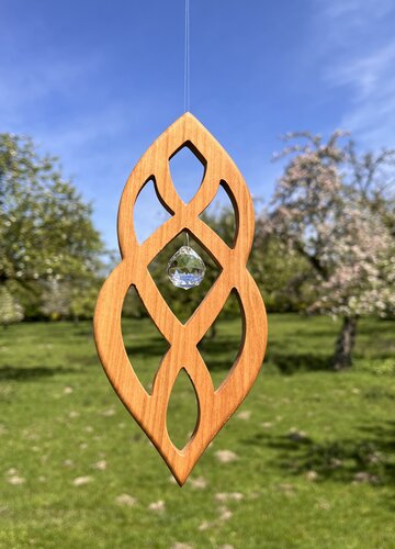 Chance mit Kristall Chance - lebendiger Fensterschmuck Verschlungene Pfade, alle führen zum Ziel. Unsere Fensterdekorationen lassen den Raum regelrecht erstrahlen. Auch in der jahrtausendalten chinesischen Lehre des Feng Shui spielen Kristalle eine zentrale Rolle. Ein im Fenster hängender Regenbogenkristall bringt mit der Brechung des Lichts positive Energie in den Raum. Die handwerklich gefertigten Naturholzobjekte aus Birnbaum oder Kirschbaum bilden dafür eine hervorragende Basis. Mit den funkelnden Akzenten aus feinsten geschliffenen Glaskristallen ist der Fensterschmuck perfekt. Höhe 19,5 cm Kristallkugel 20 mm Holzart: Kirschbaum |
