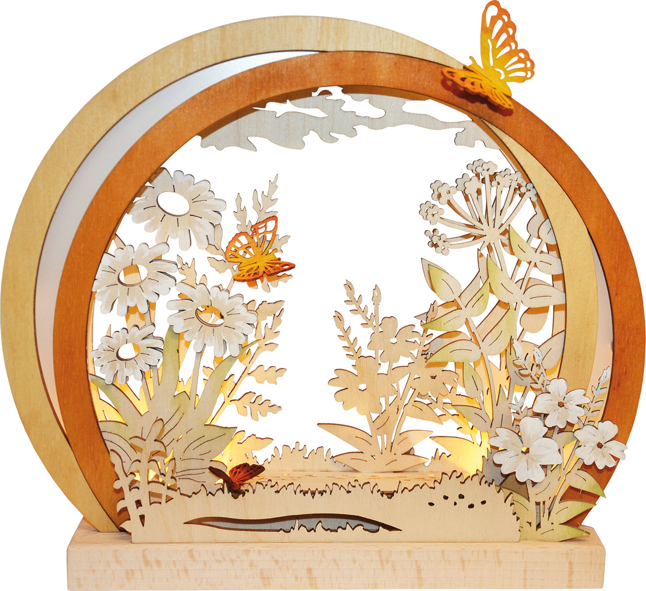 Romantikleuchte, Frühlingswiese, LED, runde Form Größe: 27 x 24 cm (BxH) Beleuchtung: LED-Stripe Diese frühlingshafte Romantikleuchte mit indirekter LED-Beleuchtung wird Ihre Räume stimmungsvoll verzaubern. Sie kann individuell mit Figuren bestückt werden. unverbindliches Bestückungsbeispiel. Echte Handarbeit - Made in Germany - 100% original Erzgebirge |